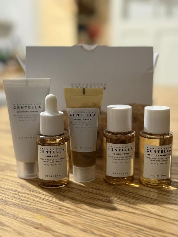 Kit de cinco productos en tamaño miniatura de la línea Madagascar Centella de SKIN1004. Este kit está diseñado para proporcionar una rutina completa de cuidado de la piel, ideal para viajes o para quienes desean probar estos productos antes de adquirir los tamaños completos.